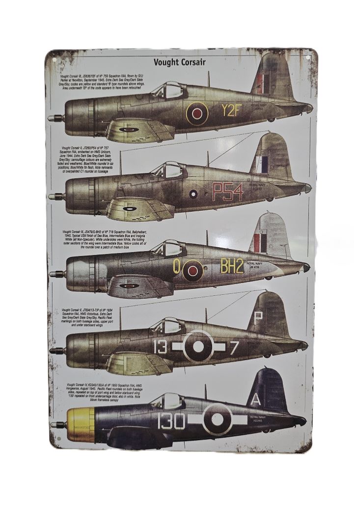 Letrero Metálico Vintage con diseño de varias versione del avión F4-U Corsair empleados por la RAF en la WWII.