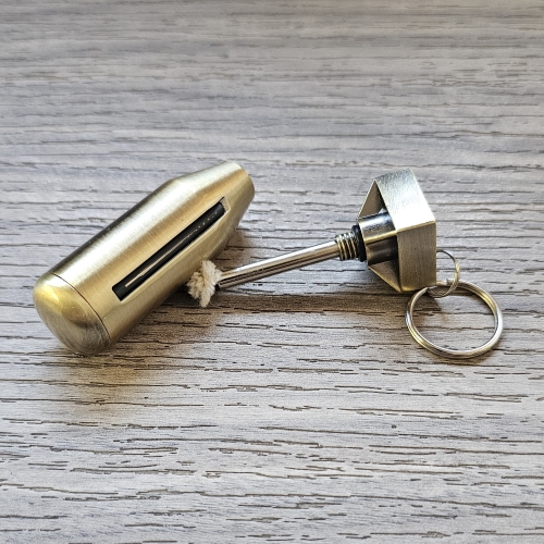Sobrio y elegante llavero Encendedor Tipo «Bomba 500 Lbs.», con pedernal y se carga con bencina blanca del tipo para encendedores Zippo.