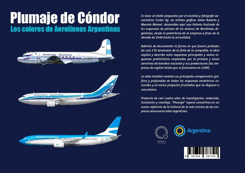«Plumaje de Cóndor: Los Colores de Aerolíneas Argentinas» es un libro que recorre la evolución visual de la aerolínea de bandera desde su creación en 1950 hasta la actualidad. Escrito por Javier Roberto, Marcelo Morard y Carlos Ay, la obra ofrece un detallado análisis de los esquemas de pintura de sus aviones, destacando los cambios en identidad corporativa y diseño a lo largo de los años. Con abundante material fotográfico e información histórica, el libro resulta imprescindible para amantes de la aviación y del diseño aeronáutico, reflejando la transformación de la empresa en el contexto de la aviación comercial argentina.